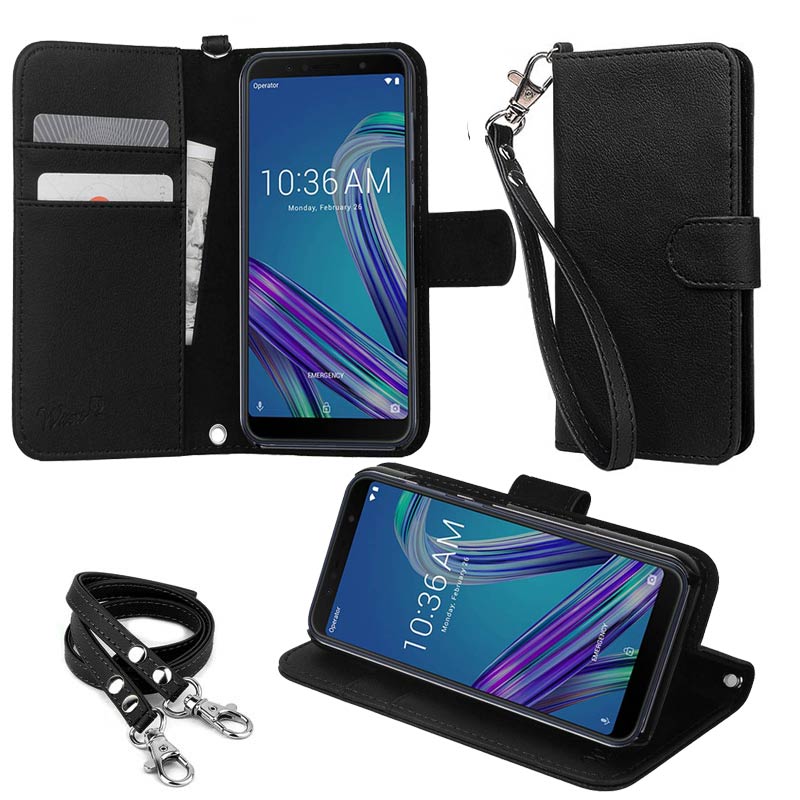 wisers ZenFone Max Pro (M2) ZB631KL ケース 手帳型 [ ストラップ 2種付 ] スマートフォン スマホケース ハンドストラップ ネックストラップ カードホルダー [ 2019 年 新型 ] ブラック