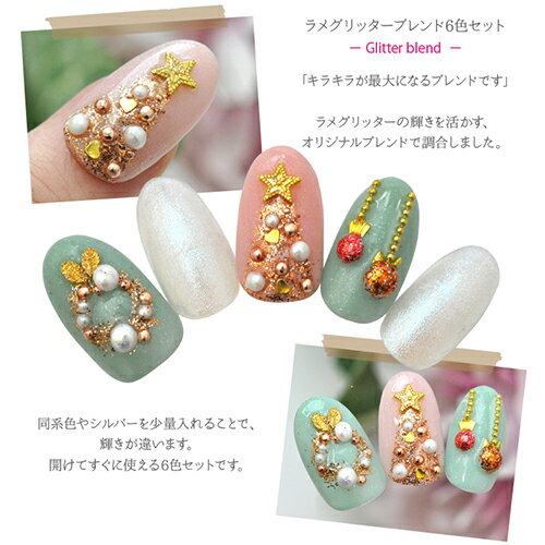 オススメポイント ラメグリッターブレンド6色セット(glitter blend) 「キラキラが最大になるブレンドです」 ラメグリッターの輝きを活かす、オリジナルブレンドで調合しました。