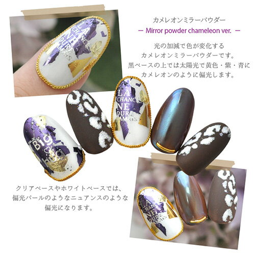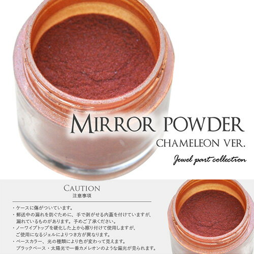 製品情報 梱包数 1ケース/内容量:3g 発送方法 メール便190円/佐川急便470円(沖縄・離島以外)/ゆうパック410円〜 用途 ジェルネイル用品 オススメポイント カメレオンミラーパウダー (Mirror powder chameleon ver.) 光の加減で色が変化するカメレオンミラーパウダーです。